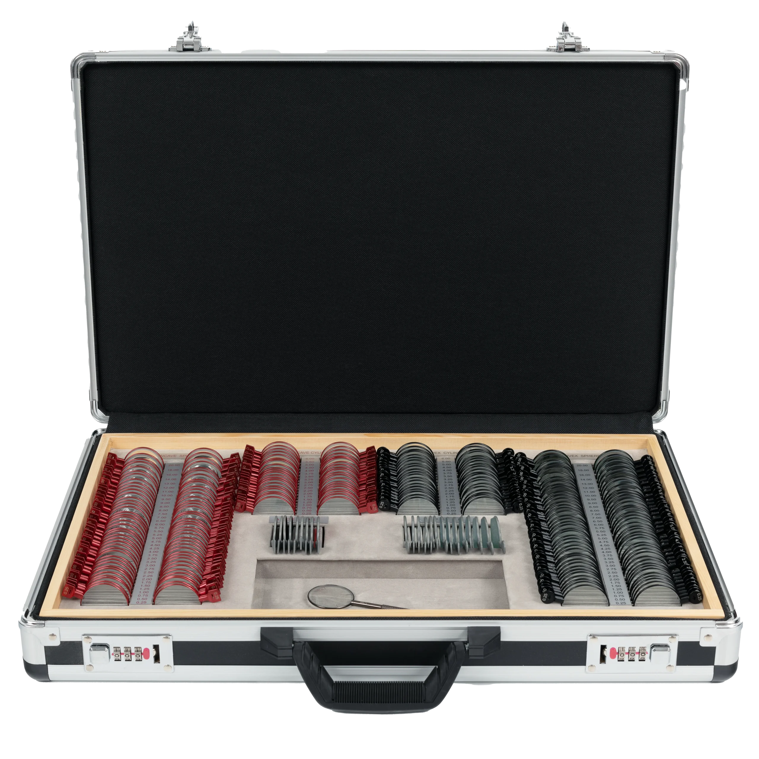 All the lenses have been made of mineral glass Ø36mm, fitted in copper alloy rims Ø38mm, cylinders clearly marked. Additionally, the axis of the cylinder is aligned with the lens holder, which facilitates work in a dark room. The whole set has been placed in a portable carry case.